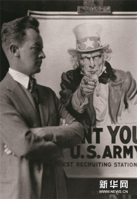 1918年,詹姆斯・蒙哥马利・弗拉格骄傲地站在他规划的闻名征募海报前。这款海报是依据之前英国基奇纳伯爵的海报规划的。