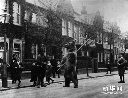 从动物的视点来看,这只跳舞的熊的日子就没那么享受了。伦敦,约摄于1900年。这只不幸的动物晚上被关起来,白日在城市的街道里游走给主人赚钱糊口。