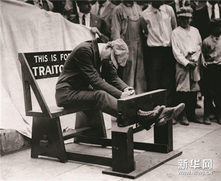 揭露的侮辱。1916年,一名揭露拒服兵役者被强令坐进特别制作的架子里。架子上印着标语“卖国贼的下场”。英国初次开端施行强制征兵。