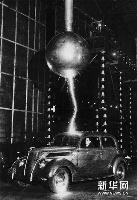 雷击测验。在匹茨堡市的西屋公司,一辆轿车被300万福特的电压击中。乘客开心肠发现了自己没有受伤。
