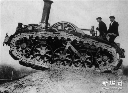一战中前期坦克的原型。1902年,林肯市的鲁斯汀和霍恩比制作了这辆以履带前行的农业机械。耕田的马和拉车的马相同快赋闲了。