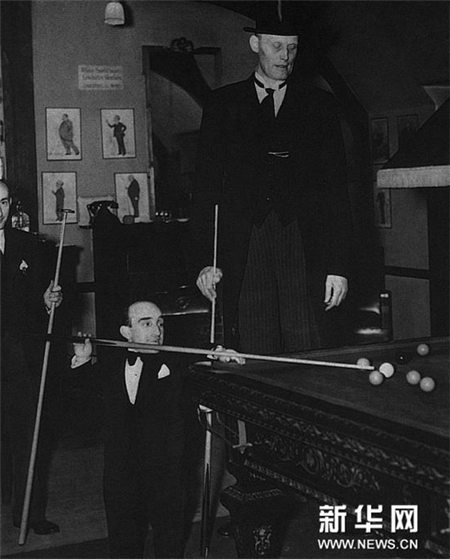 长与短:国际上最高的人——九英尺(三米)高的伊恩·范·艾伯特与只要三英尺(一米)高的乔治·阿斯利特站在一同。