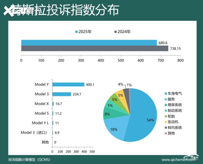 汽车质量投诉点评:去年,特斯拉投诉指数同比下滑了8%。从投诉反馈来看,驾驶辅助故障、座椅故障、部件开裂是其典型投诉问题。其中,驾驶辅助故障具体表现为主动刹车无故介入、自动泊车失灵等;座椅故障则体现在副驾头枕暴晒表层出油、座椅缝纫不良、鼓包起泡等。此外,部件开裂也遭到了车主的投诉,具体部位为天窗玻璃和后风挡开裂。值得一提的是,这三大问题的投诉量并不高,合计投诉占比11%。