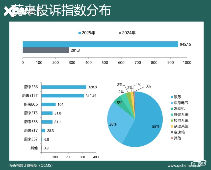 汽车质量投诉点评:去年,蔚来投诉指数同比上涨了236%,新车降价、经销商订金不退、驾驶辅助故障遭到车主投诉。其中,新车降价的投诉指数达到了354.9,占比38%,2024款蔚来ES6、ET5T是重点投诉车型。有车主投诉称,4S店销售以“清仓绝版”、“价格洼地”、“抄底好时机”、“新款必涨价”等诱导购车,隐瞒2025款全面升级且价格更低的事实。经销商不退订金和驾驶辅助故障也遭到车主投诉,但整体投诉量并不高,二者合计投诉占比9%。