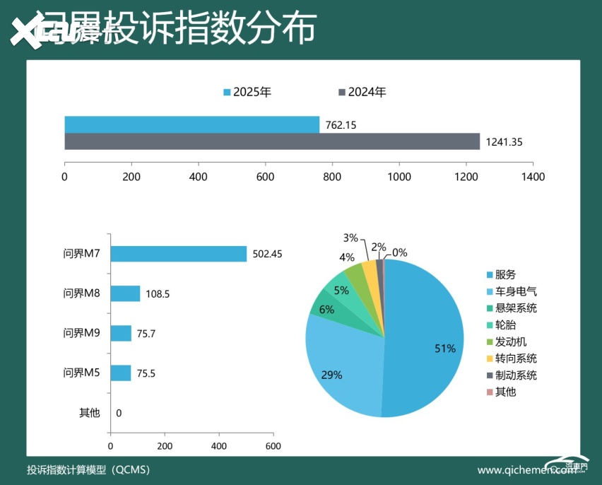 汽车质量投诉点评:2025年,问界投诉指数同比下滑了39%,成为榜单中下滑幅度最大的新势力。从投诉反馈来看,经销商不按约交车、经销商不退订金、驾驶辅助故障成为投诉原因。有车主投诉称,下订2026款问界M7时,交付专员明确承诺4-6周便可提车,但但超出承诺交付周期多周后,车辆仍未交付。交付专员表示受供应链影响,交付时间已经超出经销店掌控范围。另有车主表示,自己因车辆迟迟无法交付不愿再等待,向销售人员表示想要退款意愿时遭到拒绝。与此同时,驾驶辅助故障也遭到了车主投诉,占比9%。