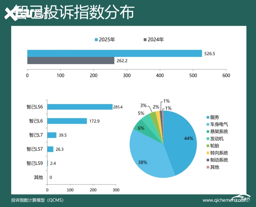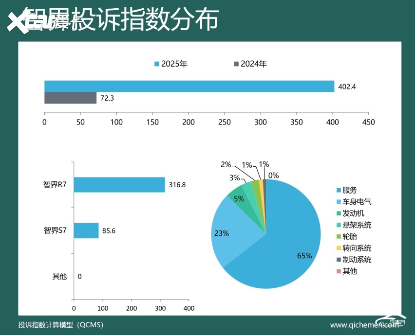 汽车质量投诉点评:过去的一年,智己的投诉指数达到了526.5,同比上涨了101%,经销商不退订金、驾驶辅助故障、悬架吃胎偏磨、空调喷白粉成为上榜理由。从投诉反馈来看,2025款智己L6和智己LS6是经销商不退订金问题的重点投诉车型。驾驶辅助故障具体表现为开启NOA闯红灯、车辆自启动冲出车位、辅助泊车不能识别障碍物等。悬架吃胎偏磨和空调喷白粉也有车主投诉,二者合计投诉占比12%。